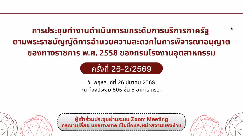 นางสาวณัสชนก วงศ์สละ อุตสาหกรรมจังหวัดสุรินทร์ มอบหมายให้ นางสาวเพ็ญนภา แพงบุดดี หัวหน้ากลุ่มโรงงานอุตสาหกรรม เข้าร่วมการประชุมคณะทำงานดำเนินการยกระดับการบริการภาครัฐฯ ครั้งที่ 26-2/2569 ในรูปแบบ Online ผ่านระบบโปรแกรม Zoom Meeting เพื่อพิจารณาปรับปรุงคู่มือสำหรับประชาชนที่เกี่ยวข้องกับใบอนุญาตประกอบกิจการโรงงาน